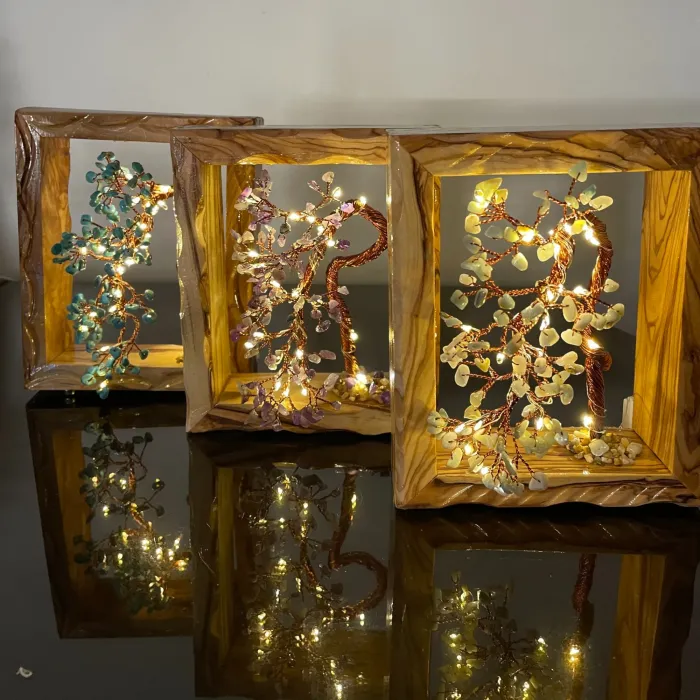 شجرة مضيئة من الأحجار الكريمة داخل إطار من خشب الزيتون – 20×16 سم (متوفرة بعدة ألوان)
